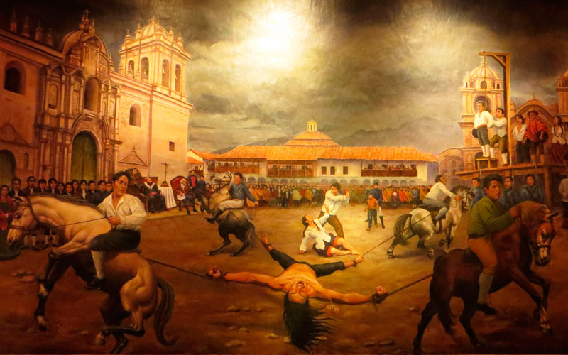 En la noche del 5 al 6 de abril de 1781, el ejército virreinal asestó el golpe definitivo a los sublevados en la batalla de Checacupe. Túpac Amaru II se retiró a Combapata, pero fue traicionado por el criollo Francisco Santa Cruz, que lo entregó a los realistas junto con su familia. Para el líder de los rebeldes estaban reservadas, en los días que mediaron entre su captura y su ejecución, las torturas mandadas ejecutar por el implacable visitador José Antonio de Areche, cuya misión consistía en averiguar los nombres de los cómplices del vencido caudillo. Sin embargo, pese a los pocos miramientos que tuvo para con el prisionero, no obtuvo de Túpac Amaru II sino esta noble respuesta: «Nosotros dos somos los únicos conspiradores; Vuestra merced por haber agobiado al país con exacciones insoportables y yo por haber querido libertar al pueblo de semejante tiranía. Aquí estoy para que me castiguen solo, al fin de que otros queden con vida y yo solo en el castigo».